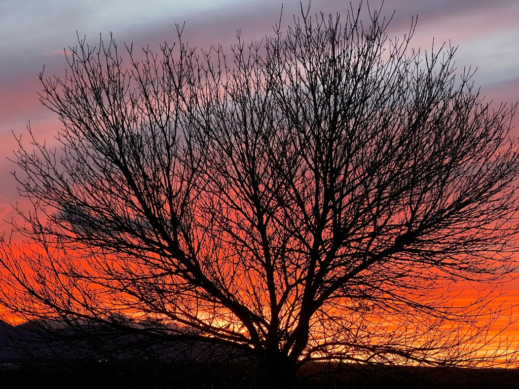 Looking out, I see small brown birds on a leafless branch in front of an azure sky. Looking in, I see peaceful, calm contentment behind a soft orange glow. I feel grounded and connected, tingling with gratitude in this beautiful place in this perfect moment. © 2025 Bruno Talerico Stafford challenge day 63/365.