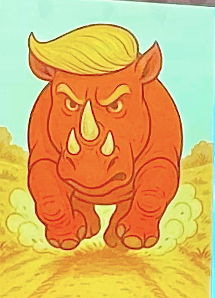 Carrot-topped, self appointed pseudo-monarch, The Rhino, destructive and shortsighted, sits, powerful and self-important, beside painted beauty queen, surrounded by deceitful rooks and scheming clergy.