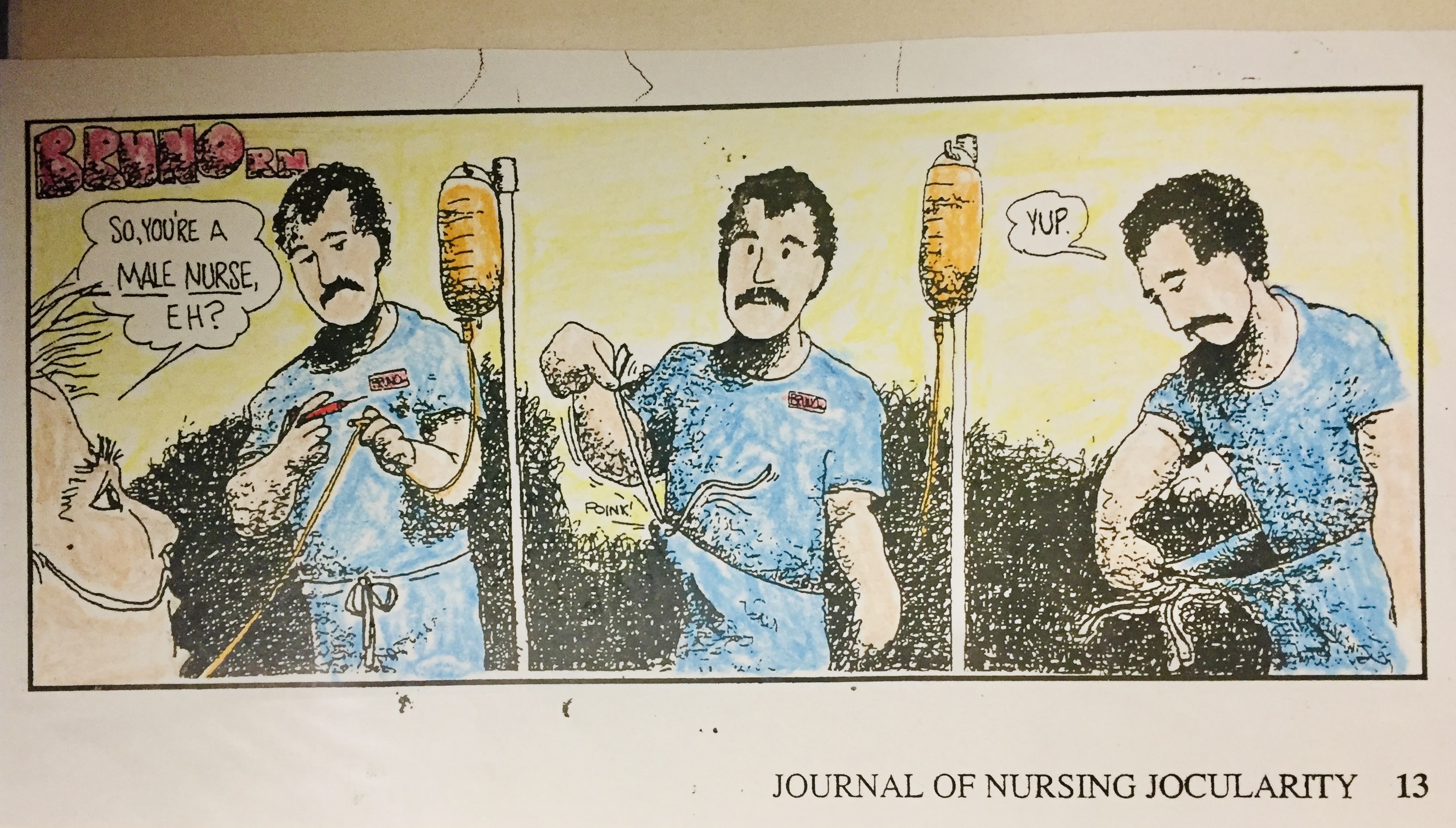 My friend John (RIP), an army flight nurse, would refer to himself and other masculine nurses as “Murses”. The image is a cartoon by my friend and colleague, Jim Gamble (RIP), another Murse.